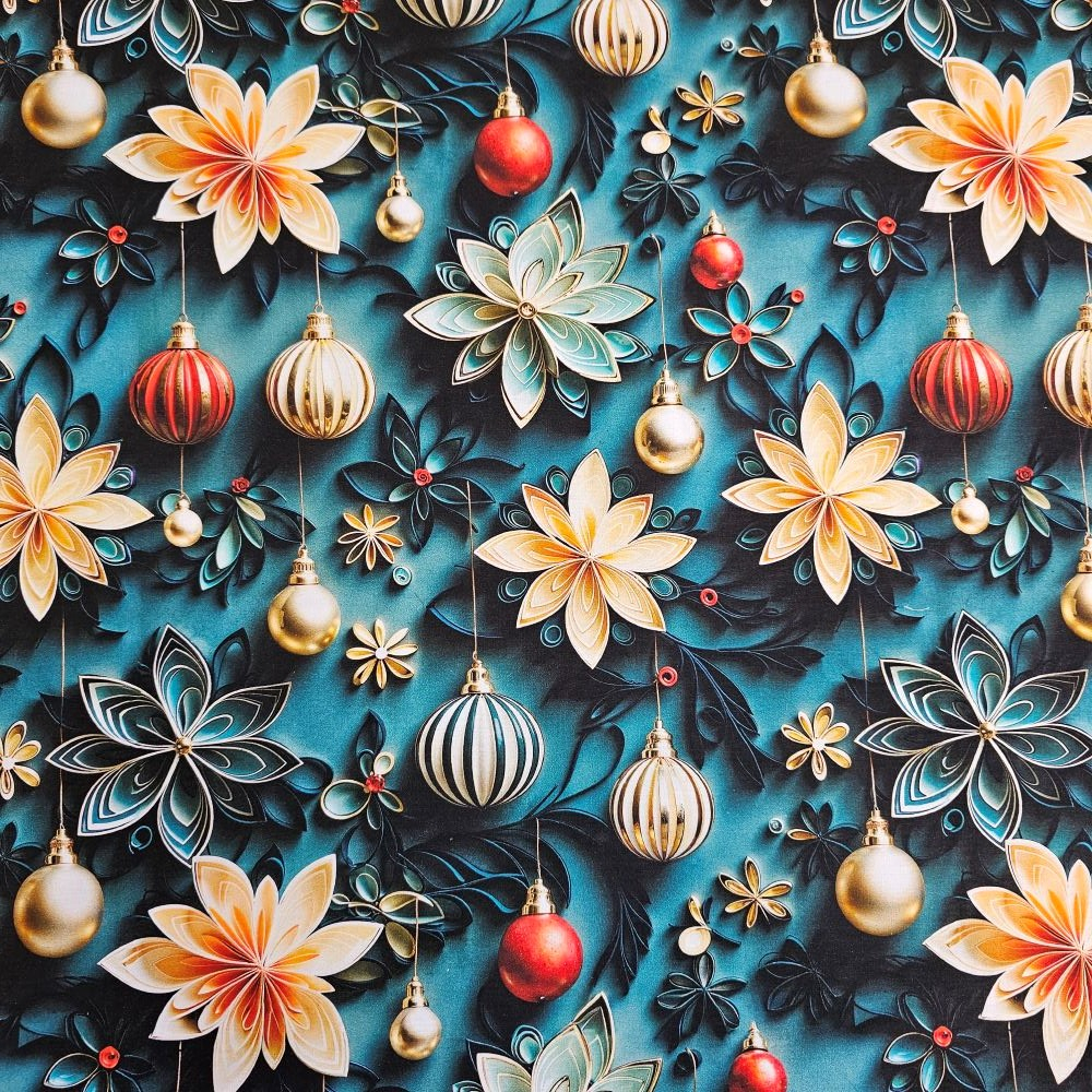 Decotex Style Material textil ranforce 5D, 240cm, bumbac 100%, Craciun - Verde cu globulete si flori