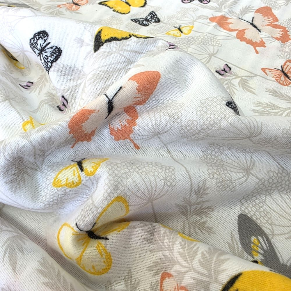 Material textil finet, 240cm, 100% bumbac, Alb cu fluturasi galbeni si portocalii