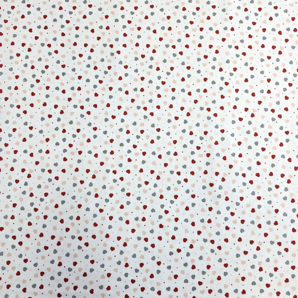 Material textil finet, 240cm, 100% bumbac, Alb cu inimioare mici rosii si gri