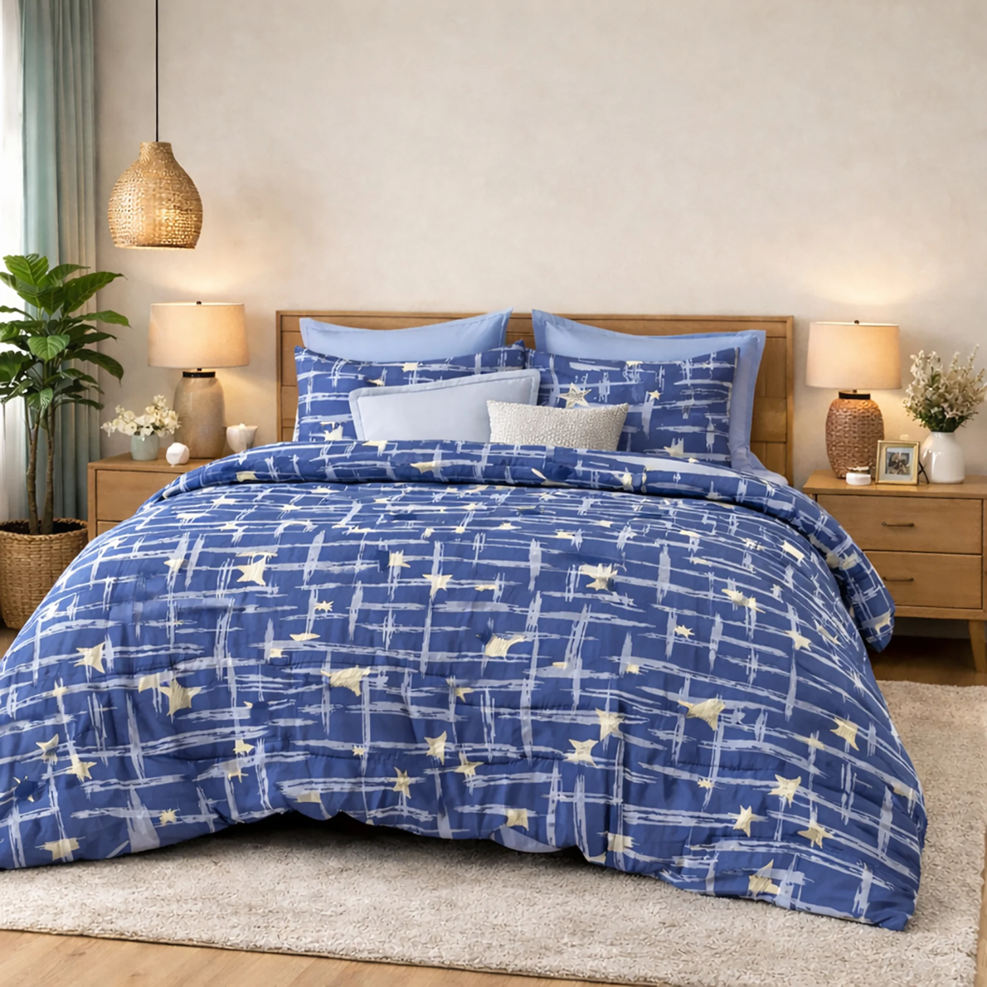 Compozitie textila: 70%bumbac+30%poliester Dimensiuni: - husă pat universală 160 sau 180x200cm cu înălțimea de 25cm - cearsaf pilota 200x220cm - 2 fete perna 50x70cm - 2 fete perna 70x70cm