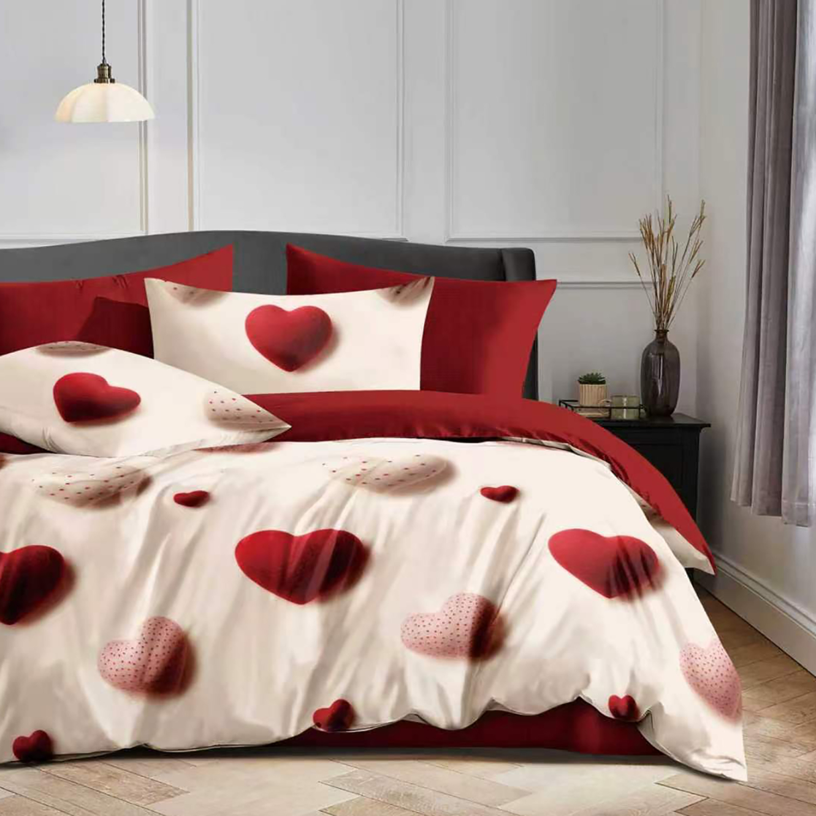 Compozitie textila: 70%bumbac+30%poliester Dimensiuni: - cearsaf pat 220x240cm - cearsaf pilota 200x220cm - 2 fete perna 50x70cm - 2 fete perna 70x70cm
