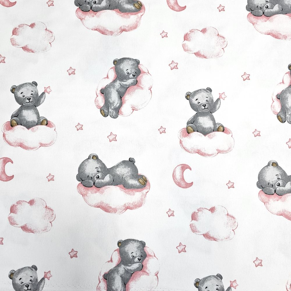 Material textil finet, 240cm, 100% bumbac, Alb cu ursuleti si norisori roz