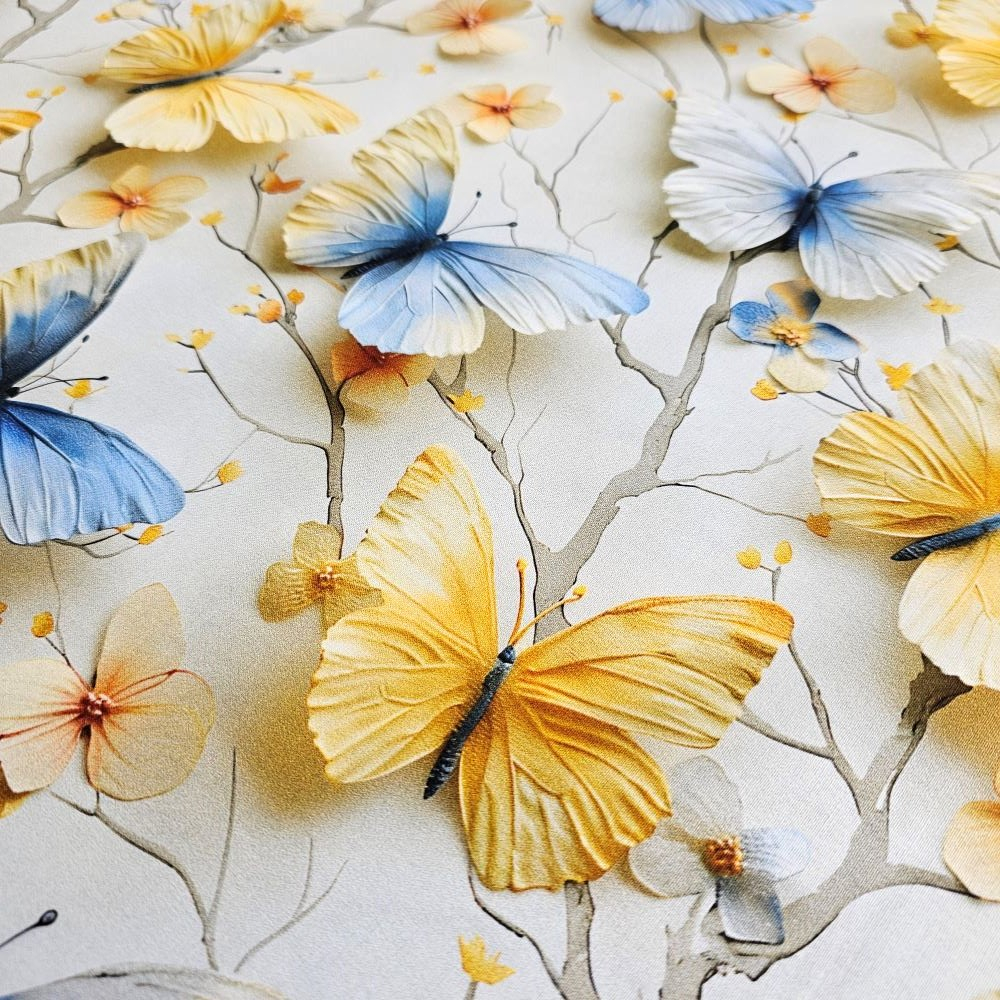 Material textil ranforce 5D, 240cm, bumbac 100%, Fluturi galbeni si albastri