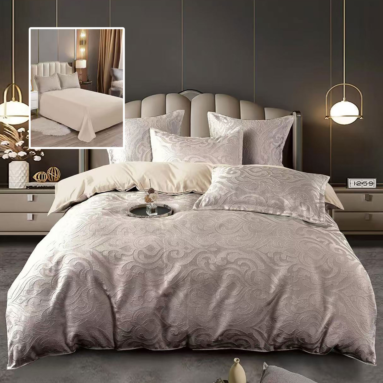Transformă-ți dormitorul într-un sanctuar de rafinament cu această lenjerie de pat realizată din jacquard-policoton, o combinație inteligentă de 70% bumbac natural și 30% poliester rezistent. Țesătura jacquard conferă un aspect sofisticat, cu modele discrete în relief, care adaugă profunzime și stil fiecărui colț al patului.