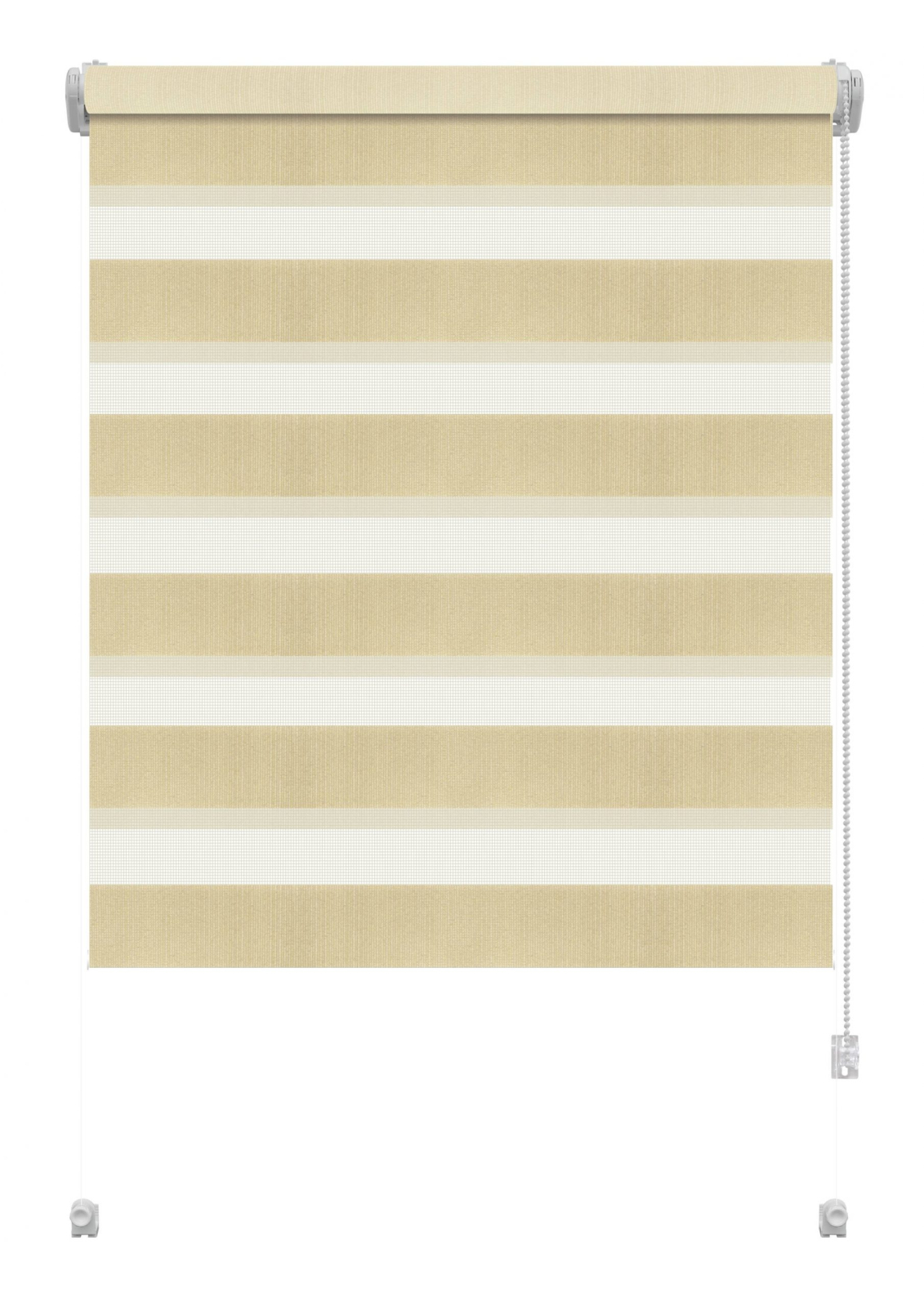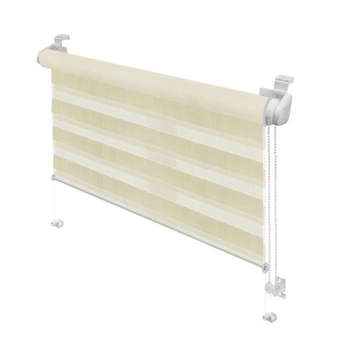 Stor textil Zebra, tip zi-noapte, cu rulou metal mini Ø18 mm, se poate monta pe rama geamului fără găurire și înșurubare. Elementele de prindere se pot clipsa pe aproape orice tip de fereastră și se poate monta și prin lipire. Stofa este confecționată din polyester 100% și este țesută în fâșii alternative transparente și opace care se suprapun in două straturi și se desfașoară în direcții opuse. În acest fel, gradul de discreție sau de iluminare se pot doza foarte exact. Se rulează / derulează cu ajutorul unui mecanism cu lanț. Lanțul se poate monta atât în stânga, cât și în dreapta.